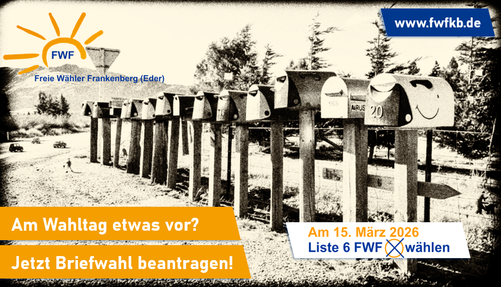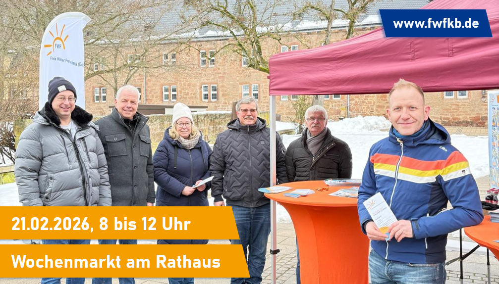 Die bevorstehende Kommunalwahl ist eine gute Gelegenheit, die Zukunft Frankenbergs aktiv mitzugestalten. Deshalb laden wir Freien Wähler Frankenberg alle interessierten Bürgerinnen und Bürger am Samstag, den 21.02.2026 ab 8 Uhr zu unserem Informationsstand auf dem Vorplatz des Rathaus während des Wochenmarkt ein. Wir freuen uns darauf, mit Ihnen ins Gespräch zu…
